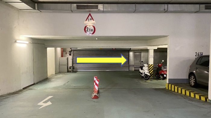 (4) within the garage, go down to the underground level (you have to turn right in front of the roller shutter, as can be seen in the picture below)